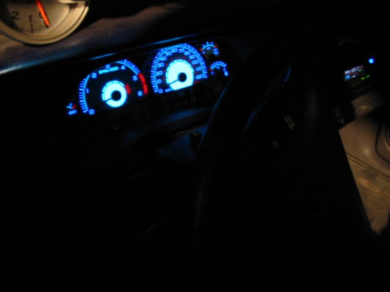 APC white face gauges with billet surround. Billet trim plates on all dash work.