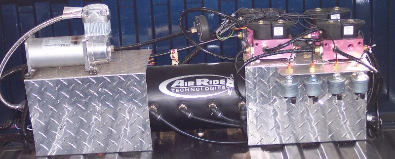 Coolride front and Parallel 4 link in rear from air ride technologies, and ride pro e controller, 5 gallon tank, 1 vair 400 compresor, 4 Big Red Valves, and 3/8 line.