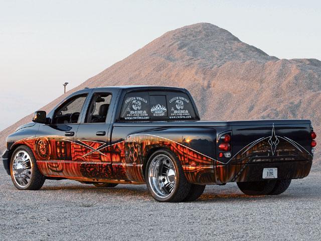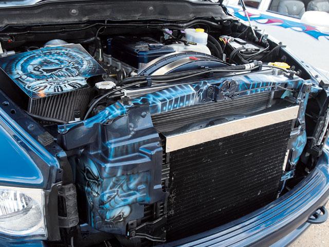 factory 5.9L 325hp Cummins turbodiesel adorned with accessories coated in House of Kolor paint. A 4-inch Flowmaster exhaust system complements the factory turbo, which features enlarged piping and runs 12 to 16 pounds of boost.