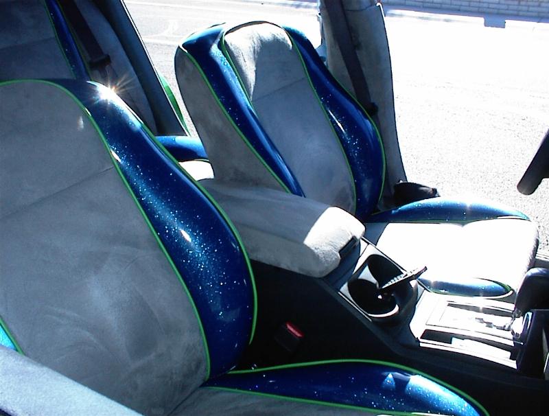 SOLD....Suede and sparkly blue vinyl... Done by Jubert of the Interior Shop Custom billet pieces by The Billet Shop. Painted lower doors, dash board and center console