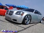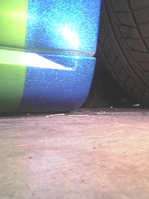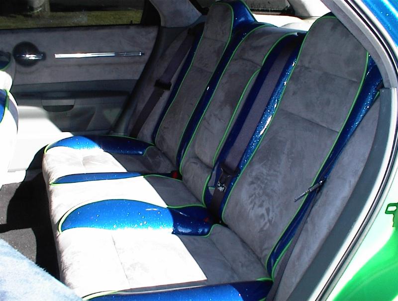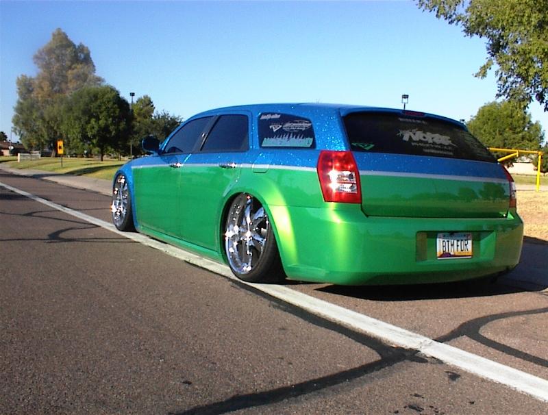 SOLD...Shaved front and rear bumper lines, front emblem, hood squirters, rear wiper, rear tailgate handle. Color changed to royal blue flake and lime time green, billet upper and lower grill, chrome divider ....Paint and body work done by John Owens. 300c chrome door handles all rear no locks. Grunions fabrication cut the car to lay flat