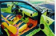 Molded door panels with MTX carved out, custom made speaker box fit to my body, painted fiberglass, neon’s, tweed, vinyl, chrome fire-extinguisher, Water Aquarium