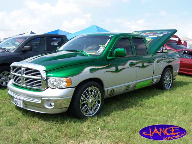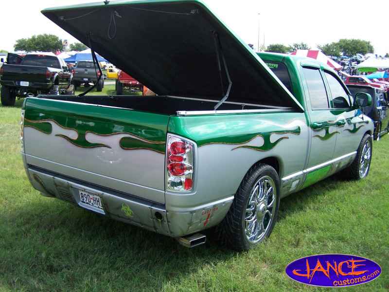 Two-tone Kandy Green over Silver.Hulk mural on bed cover.Machinery all around bottom.Under hood parts Kandy.Tailgate shaved.Hood scoop.l.e.d.'s.Train horn.