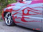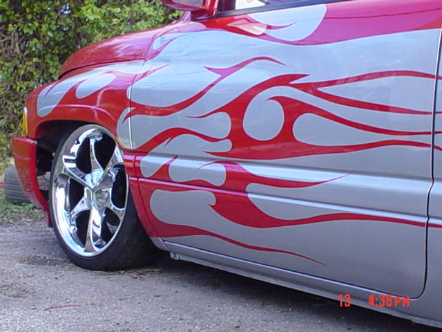Custom fiberglass door panels with skulls, fiberglassed headliner also with skulls, Smoothed out dashboard and every single plastic piece sprayed, Red & silver bucket seats, Custom Tribal Flame tint, Trenz flamed mirror, Trenz flamed pedals, Colorado Customs Flamed steering wheel