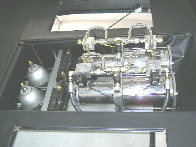2 ProHopper pumps, 4 dumps, 6 batteries, Porkys 9 switch illuminated switchbox, 8" cylinders & 3.5 ton coils front, 10" cylinders rear, Streetcharger, Accumulators and 12 volt Parker electric shut off valves on rear hydros, Belltech spindles and trans crossmember. Boxed and reinforced frame from the cab back with custom fabricated notch.