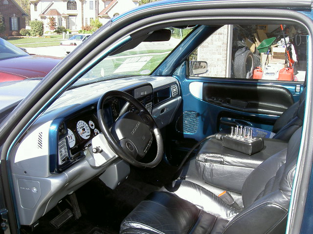 Mustang Cobra black leather bucket seats, smoothed and painted dash, EL gauges, Black headliner, Black carpet, custom subwoofer boxes/amp rack