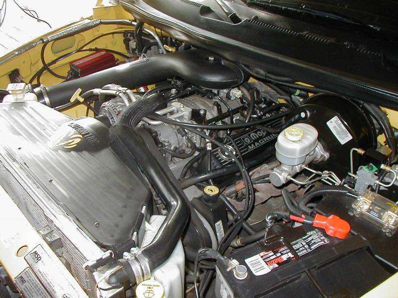 A 5.9L 360c.i V8. With a Mopar performance computer,K&N Generation 2 system, MSD digital 6 ignition,Mopar Performance ported and polished throttle body, Edelbrock headers,and Flowmaster exhaust