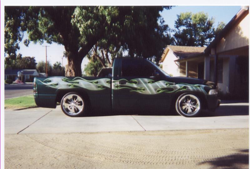 FULL TINT,RAM TAIL LIGHT COVERS, CLEAR CORNERS, ROLL PAN,STREET SCENE BUMPER W/SPEED GRILLE BUMPER INSERTS,CHROME GRILLE W/SPEED GRILLE INSERTS, FOREST GREEN, W/ STERLING METALLIC SILVER TRIBAL/TRADITIONAL FLAMES AND NEON GREEN PIN STRIP.