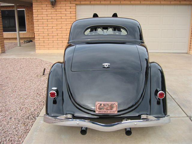 Top / 2.5” chop, with 48 Ford Coupe top used to fill in, by M. Roads Horns / Spare-tire removed, Bitchin Products firewall and floor-pan, PPG Concept DCC 9000 Black, 35’ Ford taillights modified