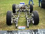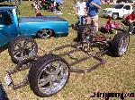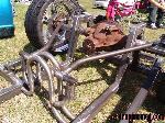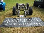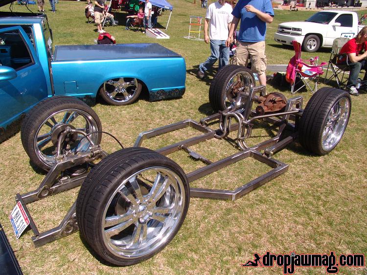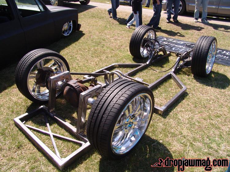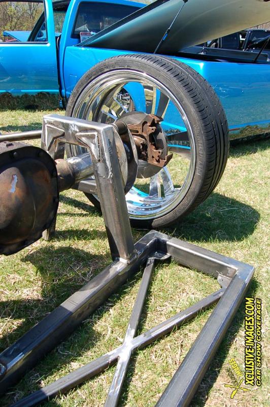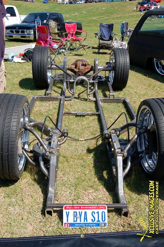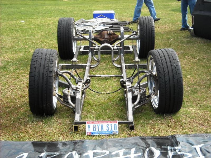 full chassis made by myself, uniballs in front, custom made control arms, suspension design done in autocad, 1 1/4" DOM 3/16 wall tubing used throughout. Rest of chassis is 2x3 3/16 wall, triangulated fourlink, 8.8 4.10 explorer rear end, toyota 2" drop spindles reamed and sleeved for bolt instead of ball joint, mustang II rack and pinion