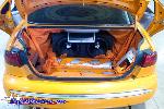 2 JL 12's, 2 alpine amps, 2 5.6 inch monitors in the headrest, a 7 inch in the console, a 14 inch in the truck