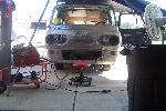front is a 86 s10 clip with 2 inch drop spindles and factory steering from van useing a custom push and pull system with heim joints designed by cookie which turns good and locks out side to side better than a s10, the back is a 93 mark 8 clip ids,which was no fun putting it in but works great,it gets 10 inches of lift in front and 8.5 in back