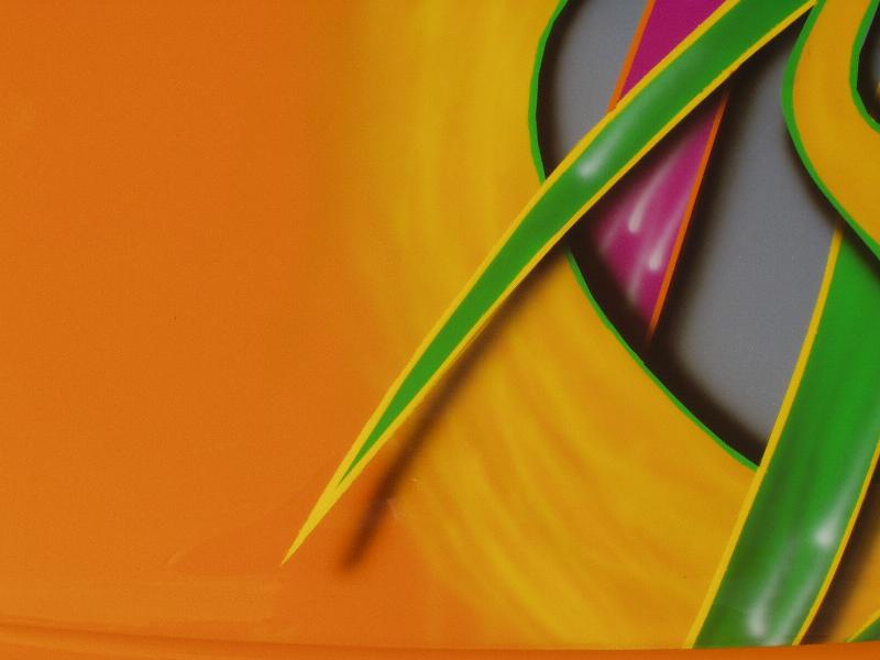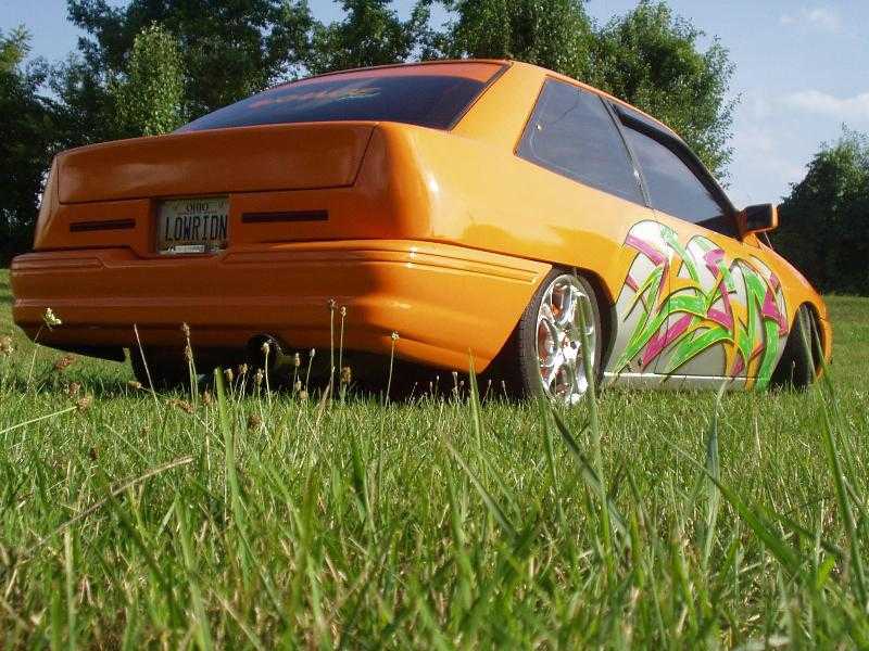 Shaved tail lights, door handles, antenna, body line. Double row l.e.d tail lights, frenched in license plate box, frenched in antenna on passenger fender, and smothed out rear of the car. Orange painted with graphics painted on the side and hood.