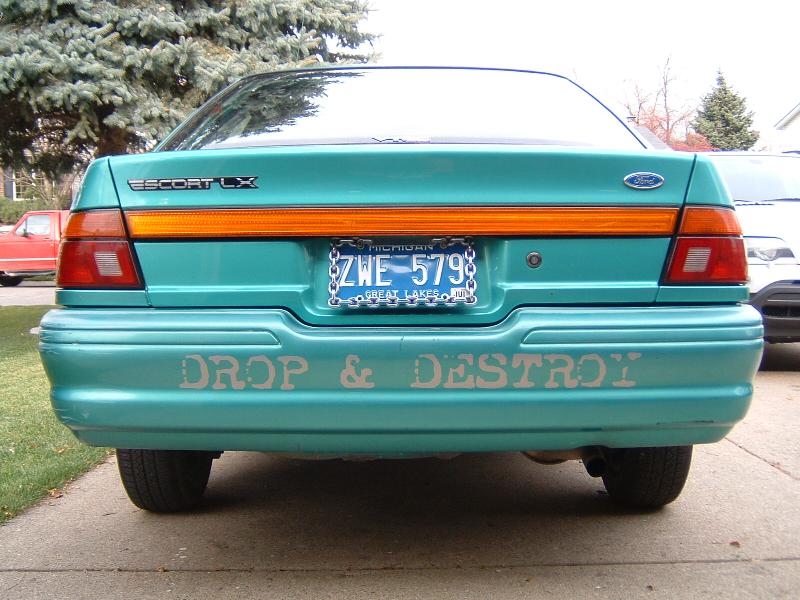 mercury tracer corner lights, "drop & destroy" sticker across back bumper.