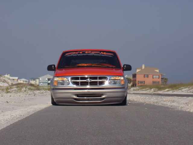 4" stock floor body drop, custom made triangleated 4-link, gets 16"s of lift in the rear. Shaved firewall, Airlift air commander engine driven air compressor, 1/2" valves, fabricated new engine mounts so the engine doesn't look gay stickin' out through the hood, fabricated front frame clip and bag mounts, new tranny cross member and fabricated rear floorboard, rear end shortend 3" and tubbed out. Fabricated aluminum gas tank, battery relocated to the rear, new exhaust system, etc. etc. etc. layin body with 20's all the way around. I am pretty sure it is/was the first 2 door Explorer stock floored on 20's. Completed Fall of 2003.