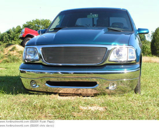 lightning headlights, cervinis cowl hood, euro clear corners, acetoned emblems, roll pan, shaved tailgate handel and ford embelem and f150 embelem on tailgate, all clear tail lights, chrome anteena base, and billet anteena, trenz billet grill, street scene mirrors, chrome lower valance with driving lights, smooth and painted upper bumper pad smooth bad caps and tailgate cap lightning 3ed brake light bed rug HID headlights