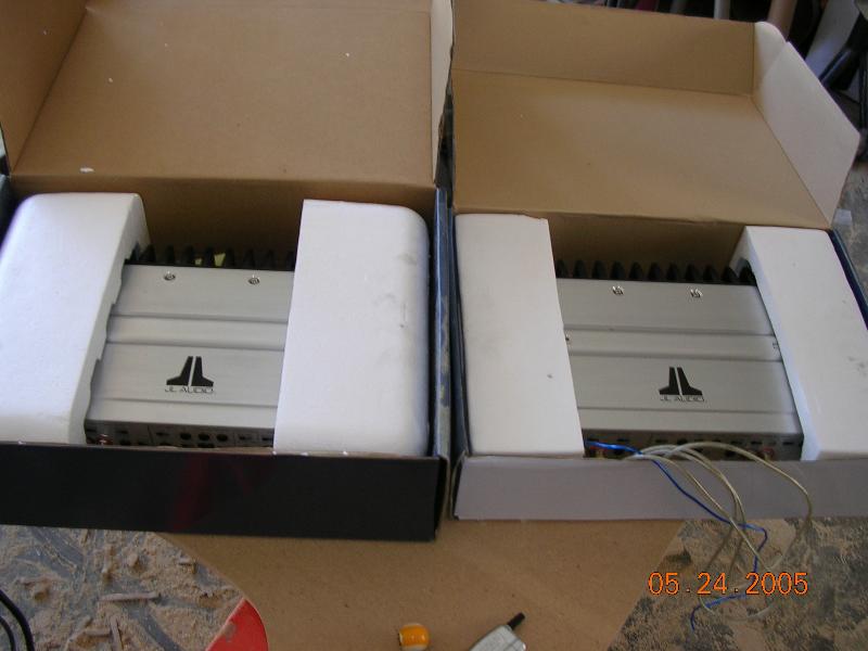 2-cm3d4 Diamond Audio subs, 2-JL audio 500/1 amps put in a custom made box with custom made center council. 4-Crystal 6.5" kevlar mids w/tweeters mounted in the center of them mounted 2-pain in each door.