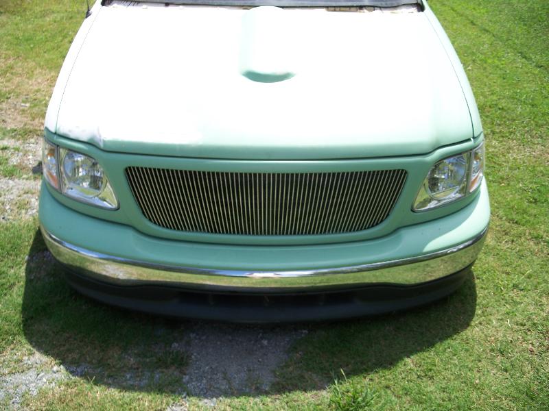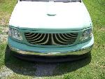 vertical billet grille, lightning headlights and corner lenses, shaved emblems.