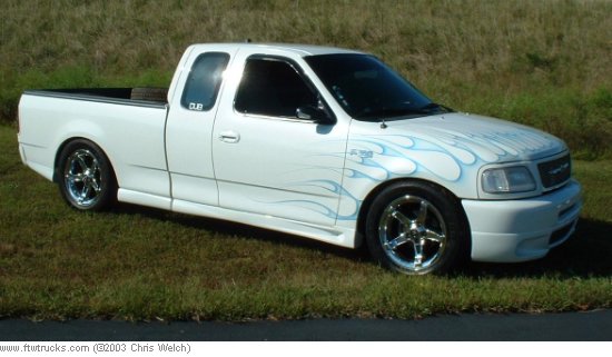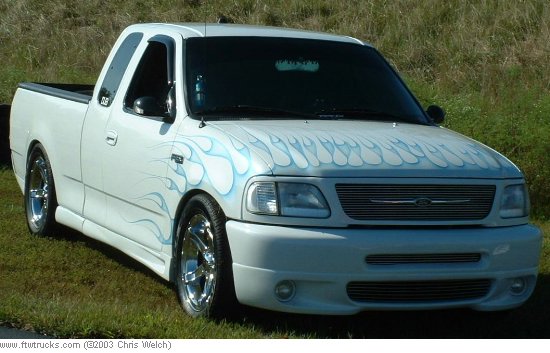 Custom Paint- Ford Oxford White w/ Silver Pearl then Blue Pearl Flames, Shaved Tailgate, Acetoned Emblems, Etc...