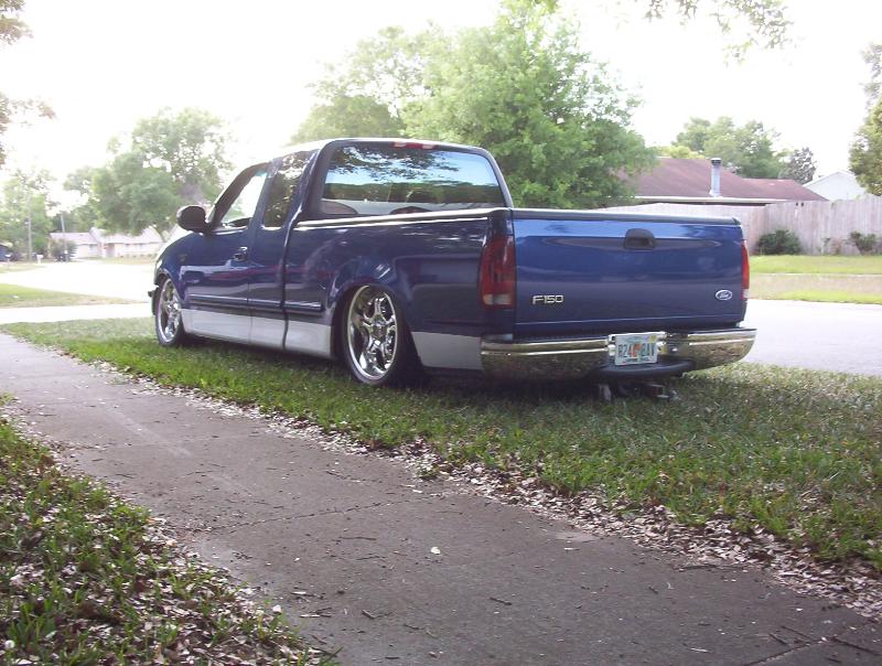 KP components 6-link cantilever with panhard bar, slam specialties bags, 2 Chassis tech 3/4 horse compressors, 8 1/2" Danz gold valves, 6 Gallon chrome tank in bed abd 7 gallon tank mounted to frame under the bed, djm lower control arms and custom drive shaft