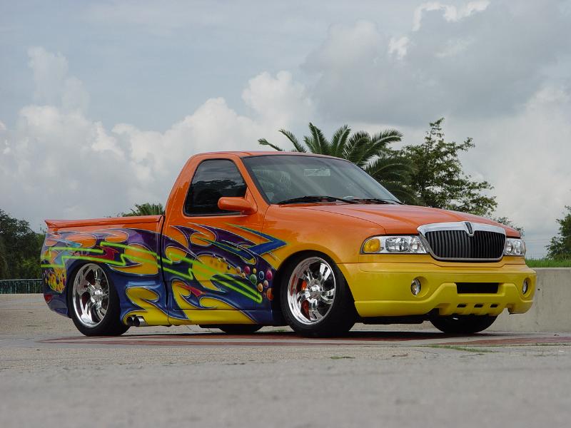 2002 Lincoln navigator front end,shaved door handles,rounded top of doors,smooth side bed steps,smooth bed rails,ground effects kit molded in,rear tail gate smoothed out,rear tail gate swings out,1995 Lincoln mark8 tail light molded in,and custom paint by Kal