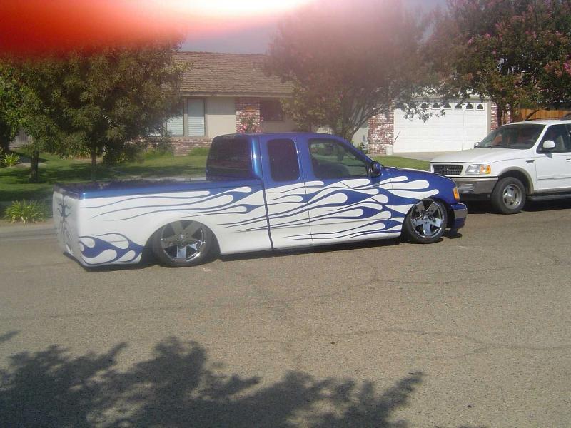 shaved doors gas door bed rails taligate and a snug top bed cover tailgate molded shut rollpan taillights shaved 15 inch leds antanne sheet metal bed HOK true blue pearl and pear white i would like to thank the guys at kaotic kustoms in reedley cali