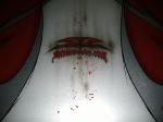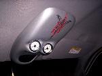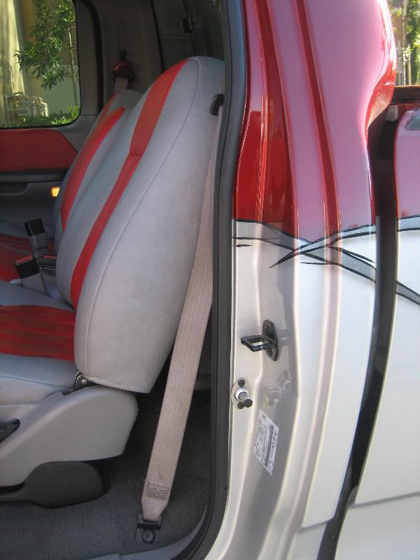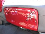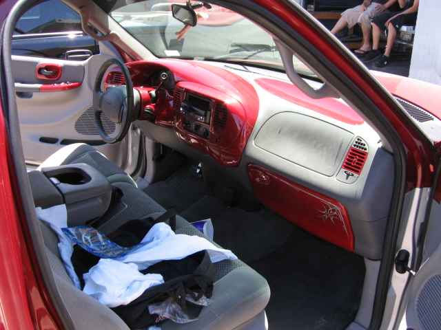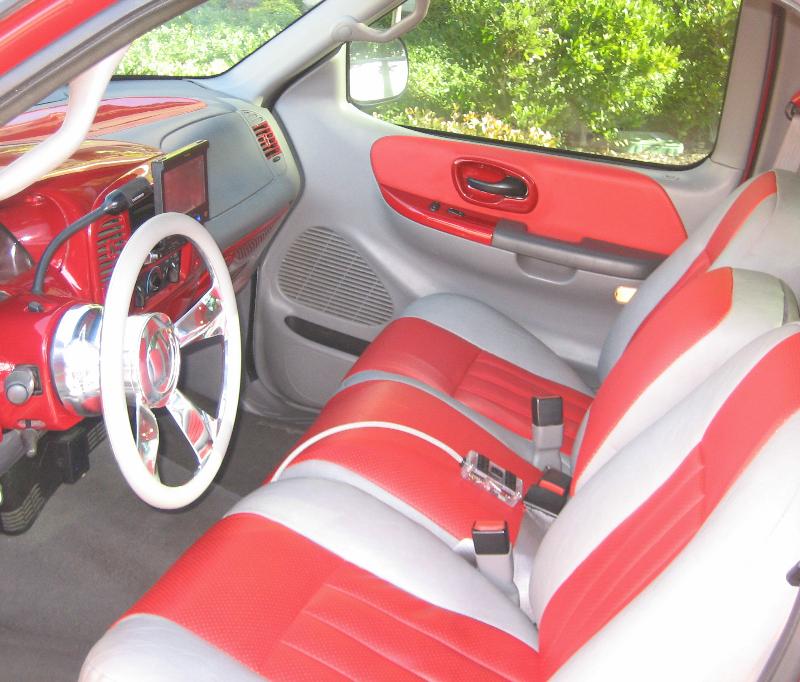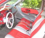 billet steering wheel, chopped seats, everything painted and covered in red, and gray