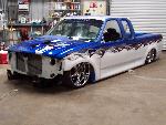 molded on tail, raised bed floor, sick ass one off bumper by bob grant. paint:ford white.dupont vivid blue effect. Flames: black traditional, overlayed with ghost chrome, spun to make it look like spun aluminum, flame work done by cosmic airbrush.