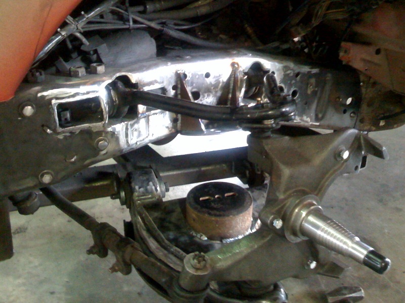 CUSTOM TWO LINK IN THE REAR WITH BAGS OVER AXLE. C NOTCH CUSTOM MADE GOOSE NECK HITCH. CHEVY SPINDLE WITH CUSTOM UPPER AND LOWER CONTROL ARMS. CUSTOM STEERING MADE WITH HEIMS AND CUSTOM CROSSMEMBER FR LOWER CONTROL ARM MOUNTS WITH HE-8 ENGINE AND TRANS HAVE BEEN RAISED 3.5 INCHES(PICS COMMING SOON)