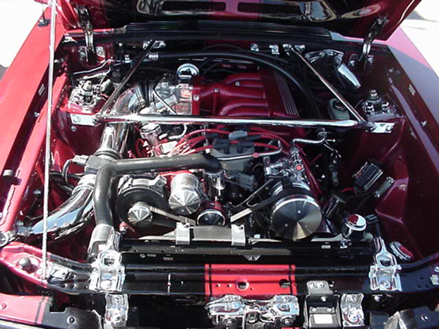 Everything is chromed or painted. Entire block is painted and detailed. 302 block, gt-40 intake, BBK 75mm throttle body, Pro-M 77mm mass air, 24lb injectors, tfs valvetrain/heads, E303 cam, Edelbrock gear drive, water pump, etc. 4 core radiator, Mac 2 5/8" headers, entire 2.5" exhaust is chrome plated, 5 spd. transmission, 3.73 gears, everything is done
