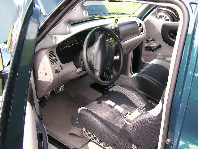 roll cage with race buckets, custom over head consel with auto meter gages billet work