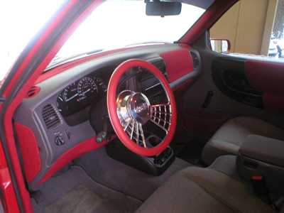 1ST GEN S-SERIES BENCH SEAT, VARIOUS PARTS COVERED IN RED AND GREY TWEED, COLORADO CUSTOMS BILLET CRAWLEY STEERING WHEEL WITH RED LEATHER HALF WRAP, APC WHITE FACE GAUGES, NU IMAGE A/C PANEL, CHROME PLATED A/C KNOBS, ONE-OFF BILLET WEBBED DOOR SILL PLATES, 3 KP AIR GAUGES GLASSED INTO RADIO BEZEL.