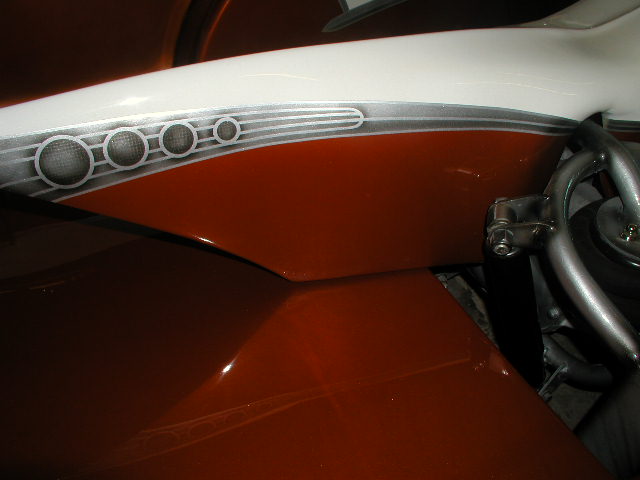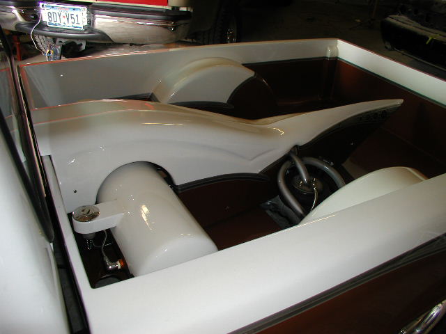 full custom fiberglass dash (with zero gauges), custom door panels, custom seats with (fake) ostrich skin inserts.