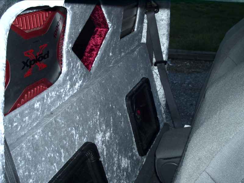 JVC Head unit, 2 12" Kicker Solobaric L5's. Custom enclosure covering the back wall.