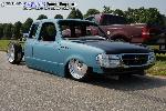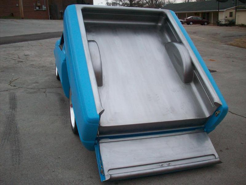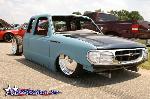 One off front bumper using Explorer parts, Explorer front end conversion, Thunderbird fender vents, shaved bodyline in front of vents, fully shaved cab, smoothed back cab wall and front bed wall with custom skins by Grant Kustoms, tilt bed, full sheetmetal bed with functioning tailgate, shaved tailgate, shaved taillights and rollpan using Grant Kustoms products