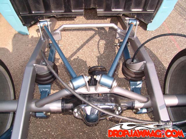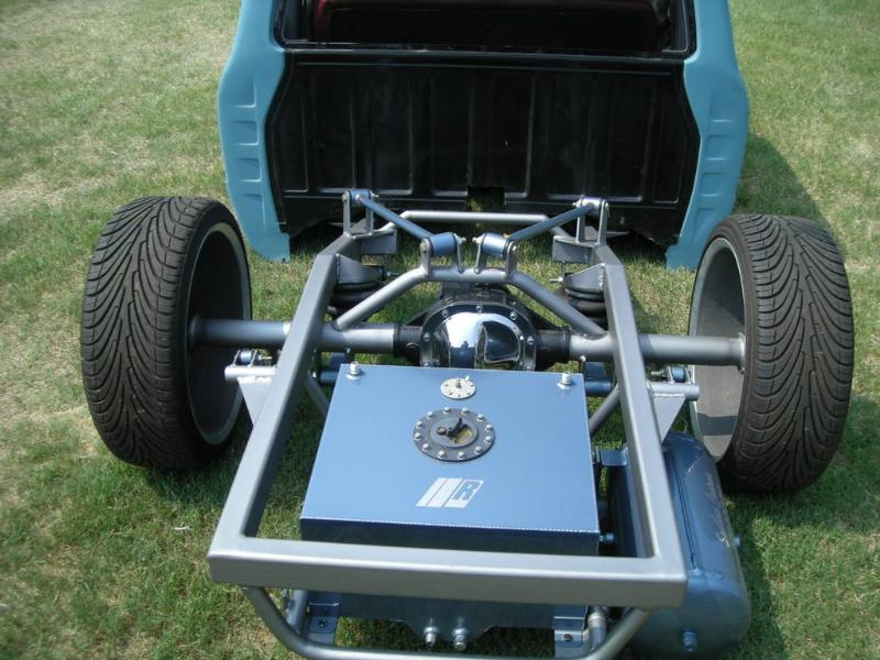 Bumper to bumper 2x3 frame, one off front suspension using Toyota spindles and a Mustang rack, Triangulated 4 link, Rear suspension and front suspension changes by Little Shop of Horrors
