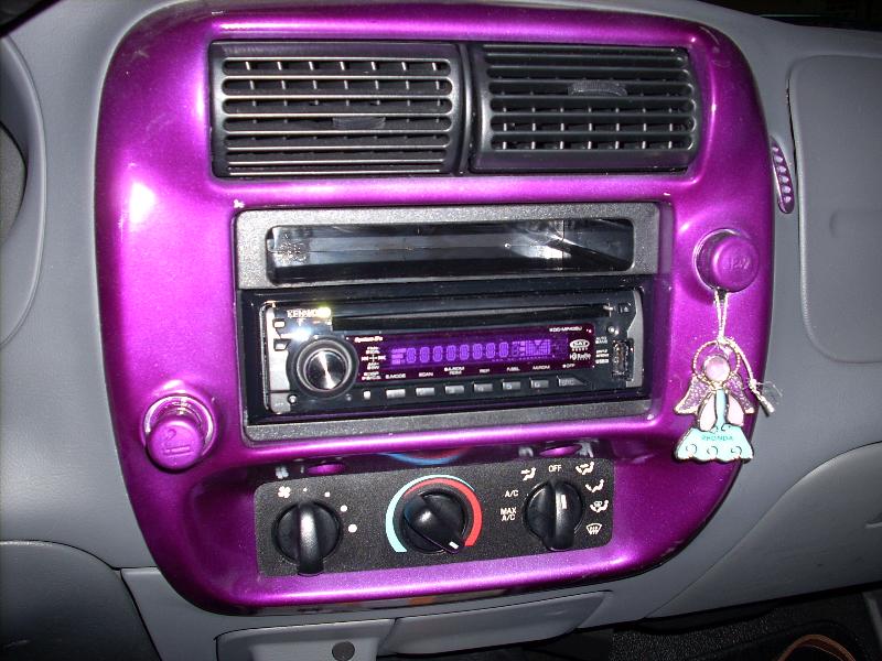 Black/grey XLT seats, purple tweed armrests, trim pieces painted metallic purple; flamed billet rearview mirror