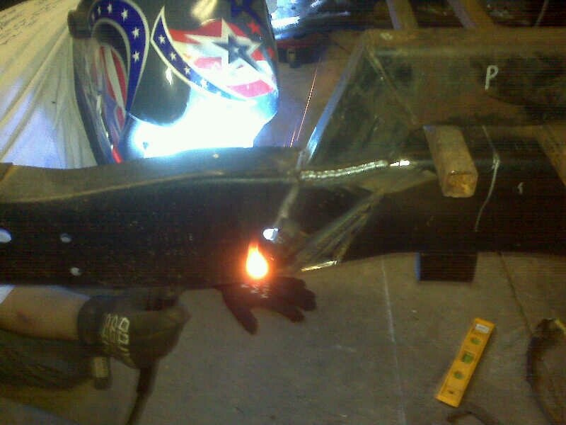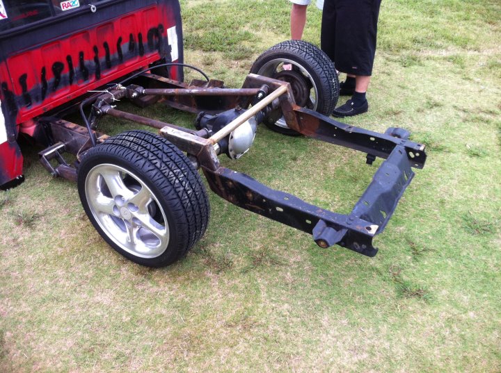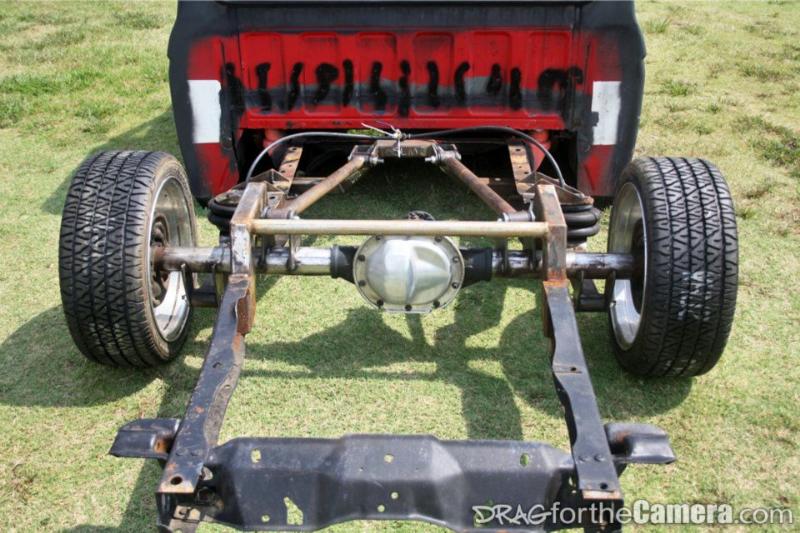 87 toyota clip, djm drop spindles, MMW upper arms, unusual fabrication lca kit, poly bushings, illusive design and fab brackets and 4 link, 1 piece 7in notch, probably mustang rear discs. dual viar 480s, 7 gallon tank and a summit fuel cell.