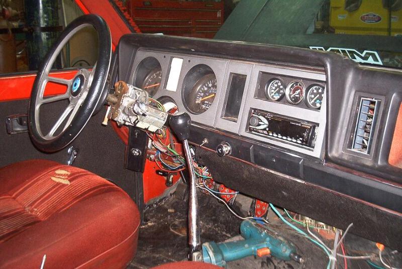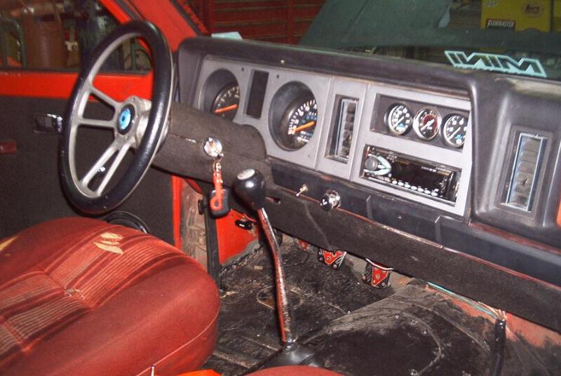 probably black and tan, 60s ford bucket seats coverd in black tuck n roll in 1969, 88 cluster w/ tach,140 mph ford motorsport speedo,ford motorsport(auto meter) oil press and water temp gagues,78 courier shift arm, hurst shift boot