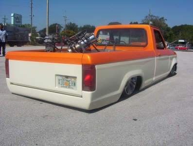 Sunset Pearl & Vanilla, Shaved: emblems, tailgate handle, stake pockets, 3rd brake light, antenae, gas door, Custom made steel cowl induction hood (5"), Widened front fenders, smoothed front and rear bumpers, 5" Body drop