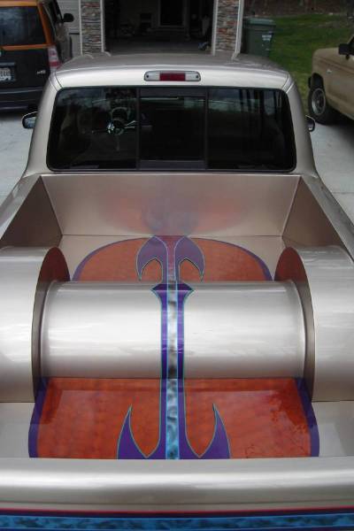 shaved emblems, bumper holes, stake pockets,tailgate,tubbed and smoothed bed and other misc junk. custom paint blah blah...