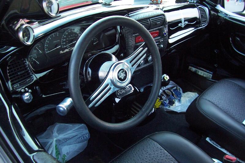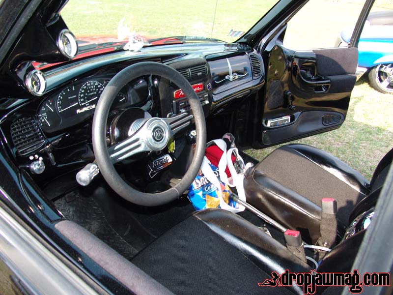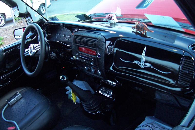Dash smoothed and painted black, pinstriping on air bag cover and grant steering wheel seats wrapped in emu and leather with dash accented in black emu.