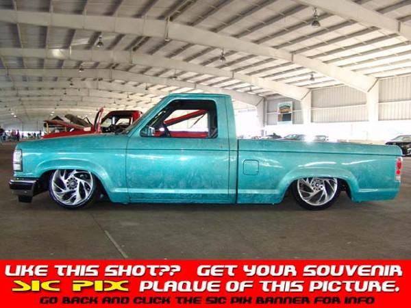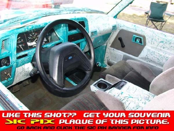 ppg ford green and white bowling ball paint with green pearl,mini flakes over it,shaved handles ,mirros cab light,emblems.Clear makerlights and tail lights. Explorer gril.