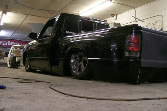 shaved doors , tailgait handle and emblems, cowl hood, billet grill, splash bed with molded roll pan, black tails