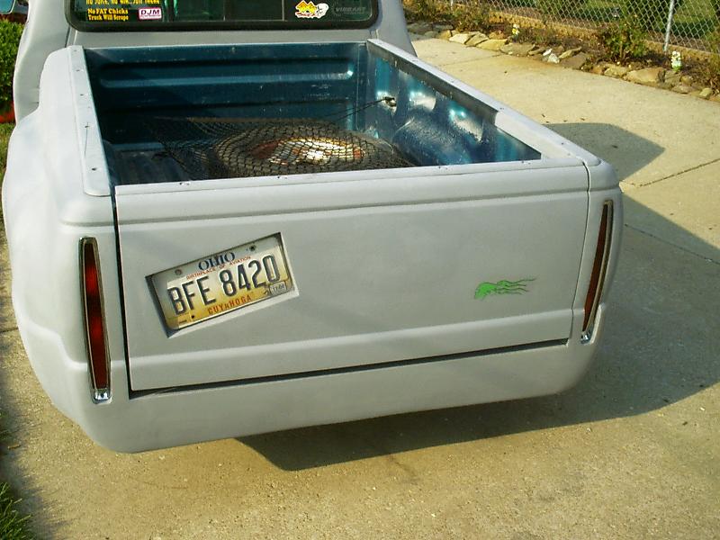 sir micheals steel roll pan molded to the bed, owner made custom grille, flipped gate handle, slanted plate box in gate. full shave, caddy tails