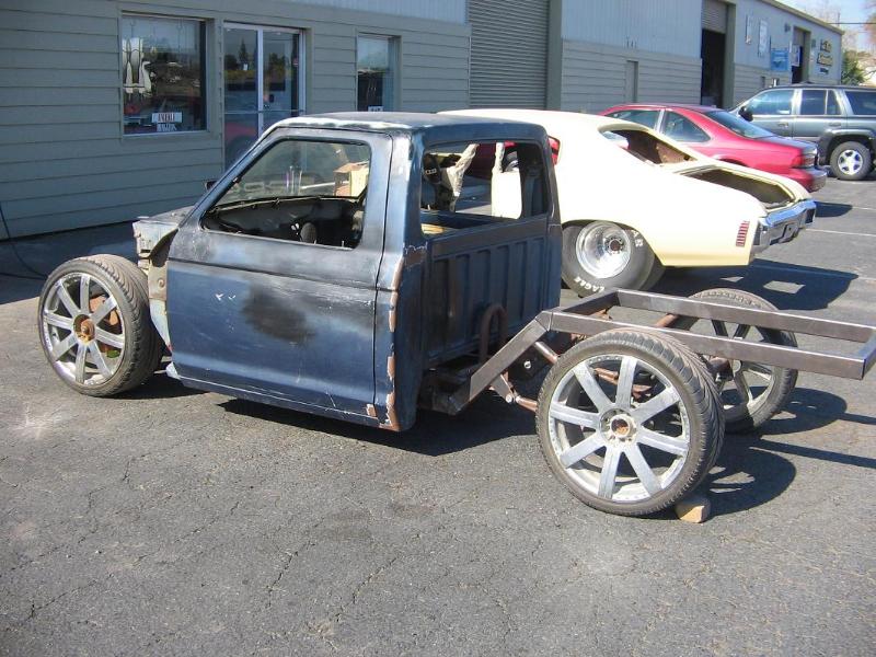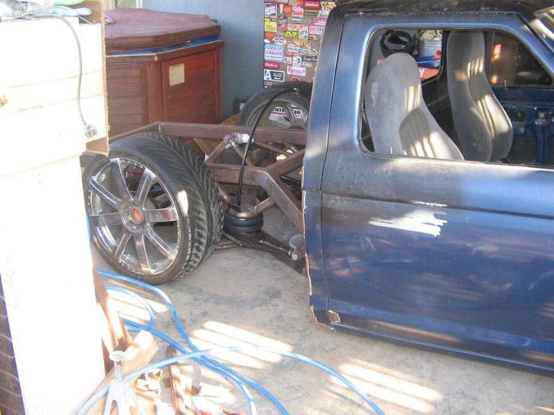 S-10 front cilp, S-10 rearend, 2X3 square tubeing, frame airtank, RE-8 all four corners, disc brakes all four corners, 1/2 danz valves,