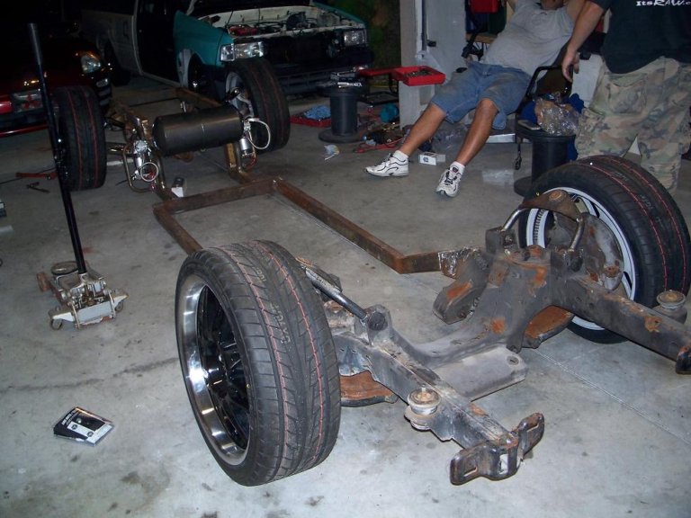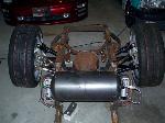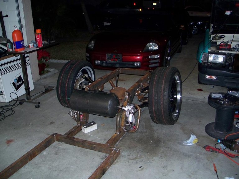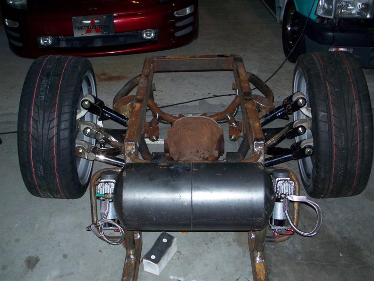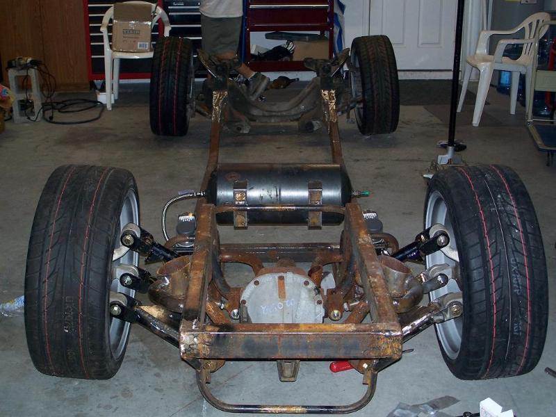 air of course.frame from firewall back to a thunderbird irs, and modified djm lowers up front(and djm uppers).cutting all the front crap off and rebuilding with mustang2 goodies