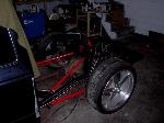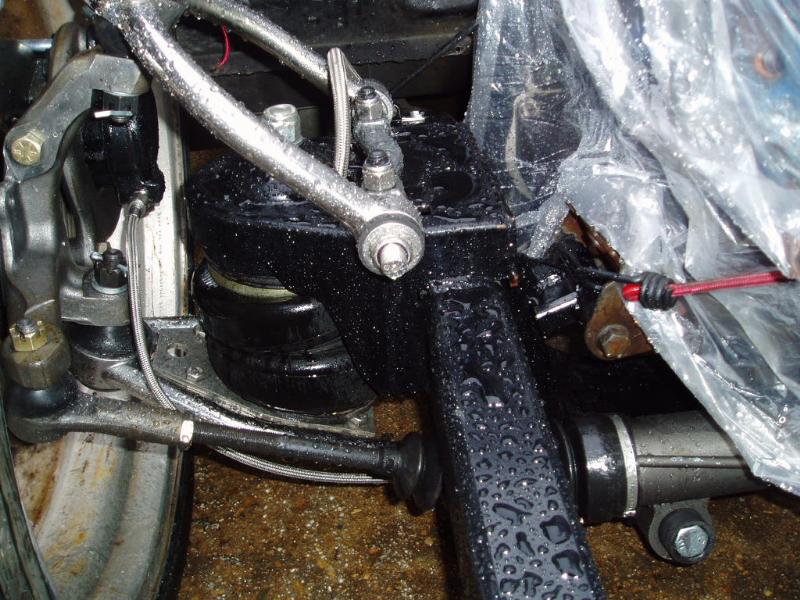 Bagged [of course]. Full custom box tube subframe and front frame section. Front suspension: Mustang II IFS with polished stainless control arms, airlift 2b6 bags. Rear suspension: custom triangulated 4-link, f-9000 sleeve bags