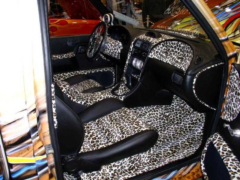 full black leather and cheeta print accents with 97 mustang dash and center console and custom flo-fit seats.