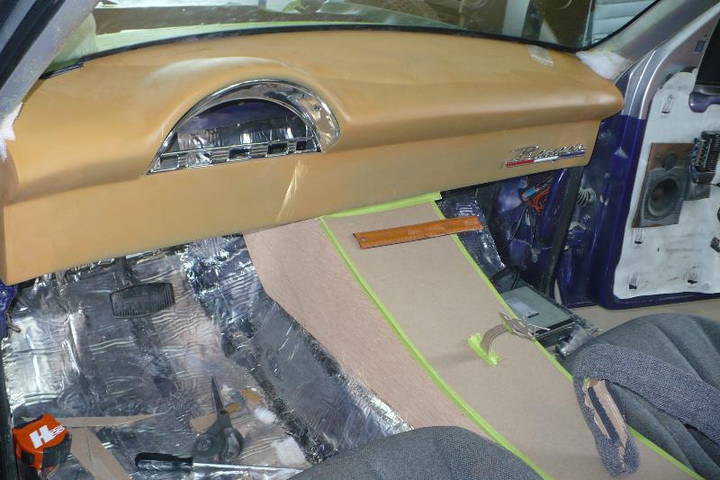 1956 ford f-100 dash full dakota digital tru blue gauges full fiberglass center console with switches and gauges mounted in painted to match seast fully covered and other pieces two toned with dark gray and some light gray suede ididit chrome tilt steering column nrc tribal billet steering wheel billett lecarra steering wheel adaptot
